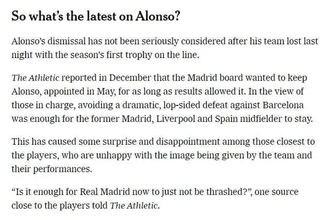 第二是欧冠连遭重创。在欧冠赛场,皇马先后以0-1负于当时在英超挣扎的利物浦,又在主场领先的情况下被曼城2-1逆转。对阵曼城赛后,媒体普遍认为阿隆索的 “未来似乎已经看到了尽头的”。