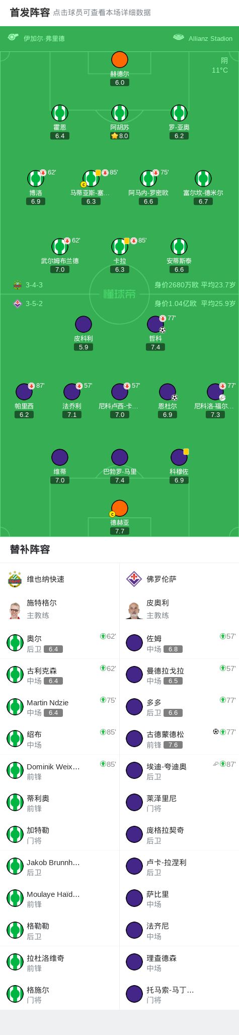 佛罗伦萨客场30维也纳快速,恩杜尔、哲科、古德蒙德松建功
