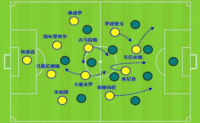 尤其是在巴西国家队,他最近3次先发都为球队破门得分,安切洛蒂对他的使用是很成功的,称得上是扬长避短。 本场与塞内加尔之战,就是摆出一个424阵型,左路韦尼休斯和罗德里戈将强度拉满,让右路后点的埃斯特旺获得更多机会。 尤其是韦尼休斯作为箭头可以随时拉到左边路,这样一来带前腰属性的前锋(无论是库尼亚还是佩德罗)都能回到反插中路,罗德里戈也能跟进。埃斯特旺内收时那几步的动作频率很快,双足能处理球优势大。
