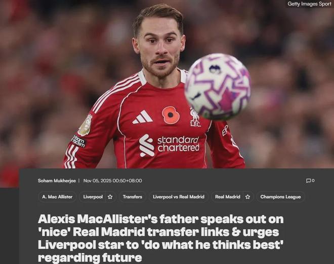 卡洛斯说:“我看到了那些传闻,但也仅此而已。根本没有相关接触,但无论如何,我儿子能和世界上那些最好的俱乐部联系在一起总是一件让人开心的事情。皇马是一家大俱乐部,但利物浦也一样,我们必须负责任,尊重麦卡利斯特现在所属且信任他的俱乐部。