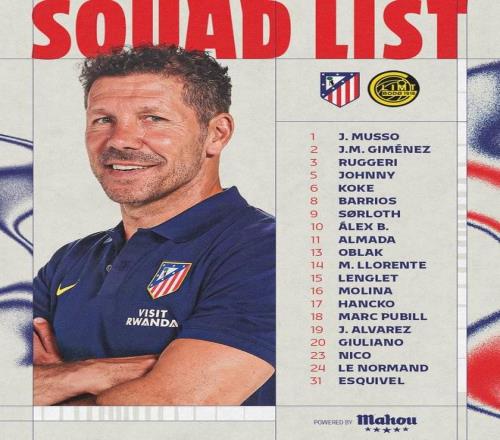 守门员:1-穆索、13-奥布拉克、31-埃斯基韦尔 后卫:2-希门尼斯、3-鲁杰里、14-马科斯-略伦特、15-朗格莱、16-莫利纳、17-汉茨科、18-马克-普维尔、24-勒诺尔芒 中场:5-卡多佐、6-科克、8-巴勃罗-巴里奥斯 前锋:9-瑟洛特、10-巴埃纳、11-阿尔马达、19-阿尔瓦雷斯、20-朱利亚诺-西蒙尼、23-尼古拉斯-冈萨雷斯 |