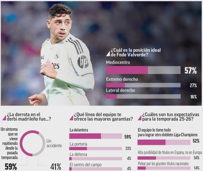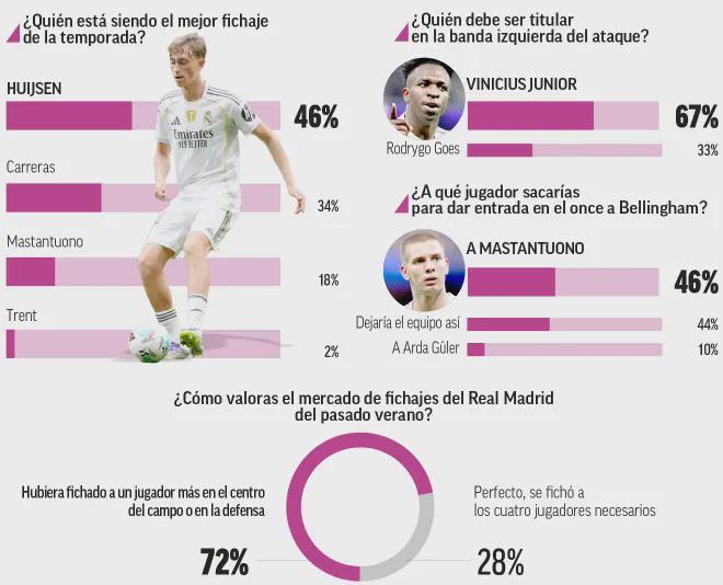 雷速体育10月8日讯 今天《马卡报》进行了一项民意调查,对皇马换帅之后的新赛季至今的表现进行了评价。 主帅阿隆索: 表现出色:53%; 表现平平:24%; 表现杰出:11%; 未能达标:10%; 未来存疑:2%。 最佳球员: 姆巴佩:90%; 居莱尔:7%; 维尼修斯:1%; 其他:2%。 最佳新援: 赫伊森:46%; 卡雷拉斯:34%; 马斯坦图诺:18%; 阿诺德:2%。 左翼最佳: 维尼修斯:67%; 罗德里戈:33%。 中场选择: 贝林厄姆:46%; 马斯坦图诺:44%; 居莱尔:10%。 巴尔韦德的最佳位置选择: 中场:57%; 边锋:27%; 右后卫:16%。 球队赛季争冠可能: 西甲冠军和欧冠冠军:52%; 西甲冠军:34%; 颗粒无收:14%。 |