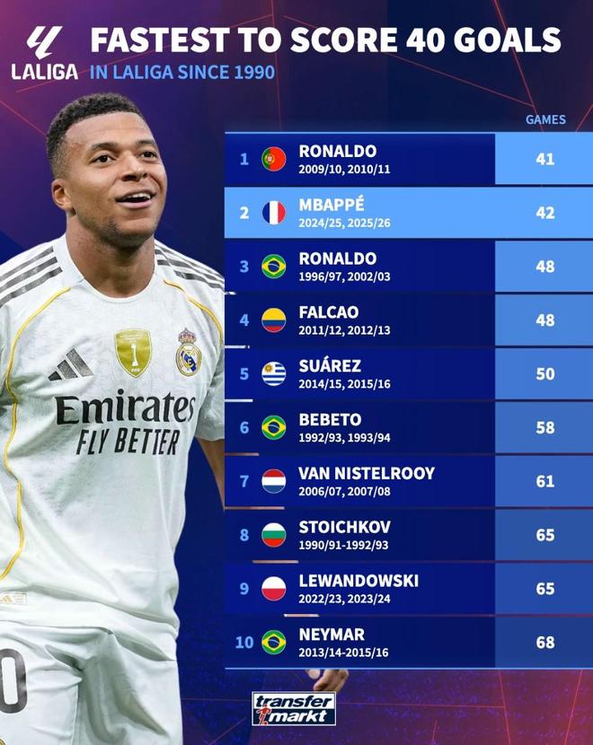 42场,姆巴佩是90年以来仅次于C罗第二快达成西甲40球的球员