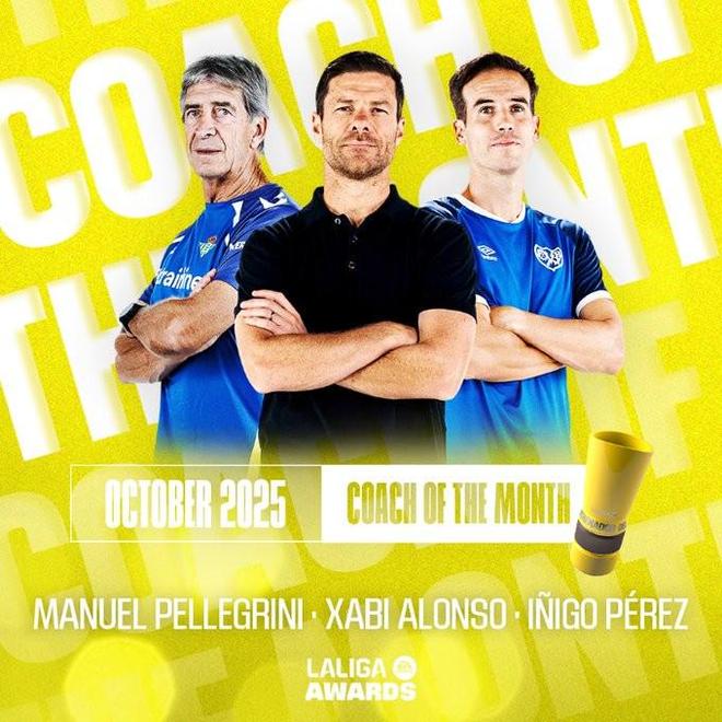 北京时间10月22日,西甲官方公布了10月最佳主帅的候选名单,其中皇马主帅哈维-阿隆索、贝蒂斯主帅佩莱格里尼、巴列卡诺主帅伊尼戈-佩雷斯在列。