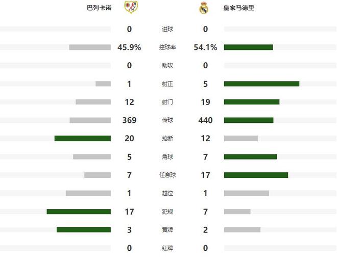 作为本赛季皇马状态最好的球员,姆巴佩上半场完全被巴列卡诺锁死,不仅没有进球和助攻,而且关键传球、创造机会和成功过人几项数据全部挂零,可以说毫无存在感,直到第52分钟才在进攻端有所表现,左路传球给居莱尔,让后者完成了一脚远射,可惜皮球稍稍偏出。 第60分钟姆巴佩才在禁区左侧完成了全场比赛第一脚打门,但没有能够命中目标,不甘心一场平局的阿隆索,随后连续换上塞巴略斯、罗德里戈和阿诺德,想要提升进攻的质量,但巴列卡诺没有给银河战舰打破僵局的机会,如愿将0-0的比分保持到了终场。