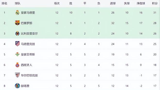 在本轮的另外一场比赛中,巴萨在客场4-2击败塞尔塔。在目前的积分榜上,虽然皇马12战积31分,依然领先巴萨3分,但是在净胜球这一数据上,巴萨17个,超过了皇马的16个。接下来皇马四个客场对手分别为埃尔切、奥林匹亚科斯、赫罗纳和毕尔巴鄂竞技。本赛季西甲争冠的悬念,再度开启! |
