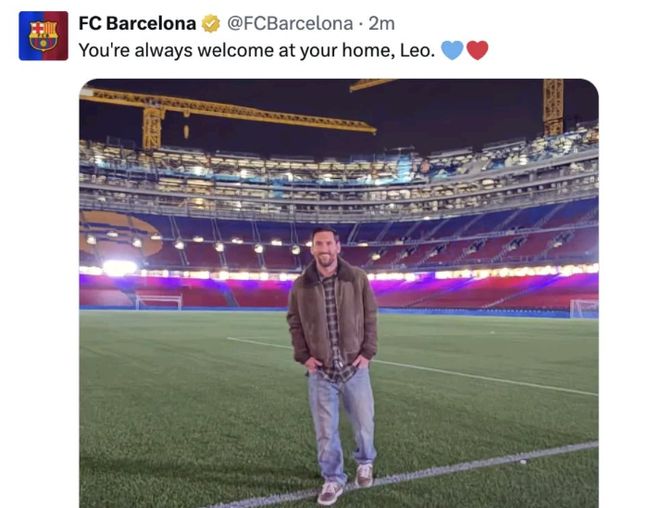 引爆社交媒体,巴萨官方表态 在梅西发布社交动态后,短短不到一天的时间,浏览量就已经超过1000万,评论量也是直接逼近百万级别。无数的巴萨球迷在评论区留言,诉说着对于这位昔日巴萨领袖的怀念。 各路媒体也纷纷撰文,所有人都希望梅西能够上演落叶归根的剧情,为自己的生涯画上一个神话一般的句号。巴萨官方当然也没有闲着,他们顺势抛出橄榄枝,发表动态表示:随时欢迎你回家! 虽然愿望是美好的,但从目前的情况看,梅西重返巴萨几乎是不可能完成的事情。