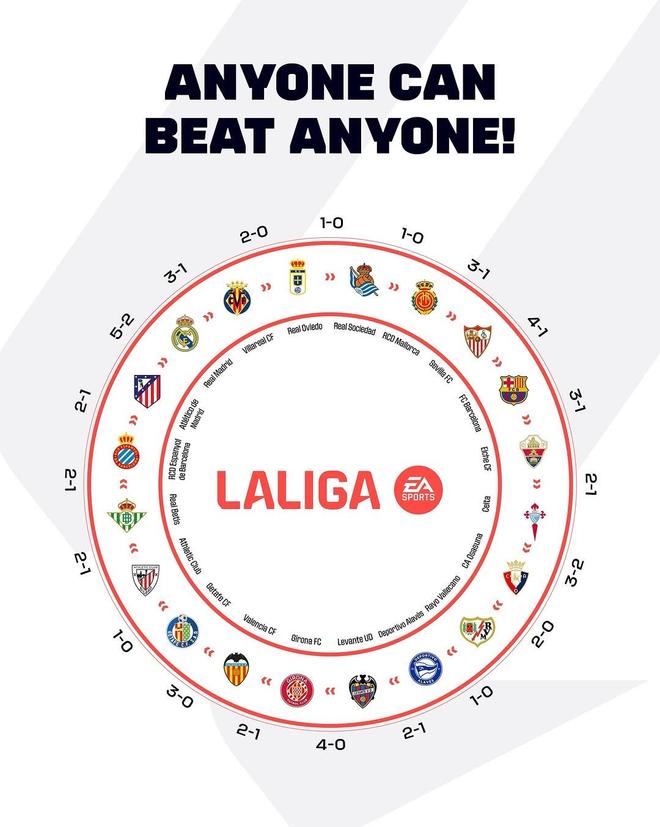 已成闭环!西甲官方晒20队胜负关系图:谁都可能战胜谁