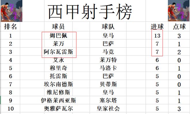 射手榜方面,姆巴佩火力很猛,场均超过1球,12轮打入13球高居榜首。莱万和阿尔瓦雷斯7球并列第2,艾永,穆里奇6球并列第4。维尼修斯,埃尔南德斯,托雷斯等人5球刚好挤入前十。