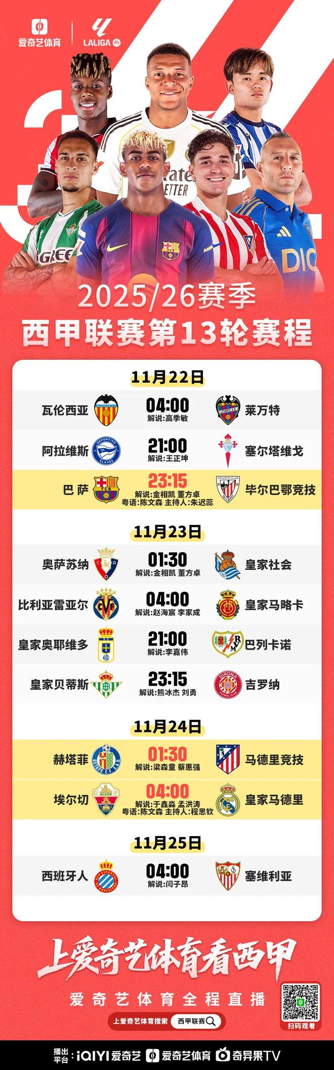 巴塞罗那vs毕尔巴鄂竞技 11月22日(周六)23:15 本周六晚,随着国际比赛日结束,西甲即将重燃战火。巴萨将回归诺坎普对阵毕尔巴鄂竞技。这是诺坎普因翻修工程暂停主场使用两年半后,巴萨首次重返这座标志性球场作战。本场比赛,爱奇艺体育将全程直播。 2022年4月,巴萨官方宣布诺坎普将于6月进行改造。2023年5月28日,巴萨主场3-0击败马洛卡,这是他们在球场翻新前在诺坎普进行的最后一场比赛。 本周六,巴塞罗那足球俱乐部将在全新的诺坎普球场迎来首场比赛。为了纪念球队历史上这一重要时刻,在对阵毕巴的比赛中巴萨球员将身穿一件特别版球衣。这件球衣胸前将带有特殊徽章,位于队徽与耐克标志之间,上面印有“Tornem a casa”(我们回家了)的字样。 国际比赛日后,弗里克迎来利好。巴萨队内不仅没有任何球员受伤,还迎回了几名伤员。已经因伤缺阵近两个月的拉菲尼亚已重新随队合练,他有望在本周六迎来复出。此外,新门神霍安-加西亚也有望在诺坎普正式复出。在他缺阵的比赛中,巴萨尚未实现过零封。至于亚马尔的情况,虽然他已经参加了球队的部分合练,但能否获得出场机会仍需接受评估。 上赛季,巴萨在西甲和国王杯赛场上曾三杀巴斯克雄狮。他们一共打进7球近丢1球。此番交手,红蓝军团能否轻松取胜?