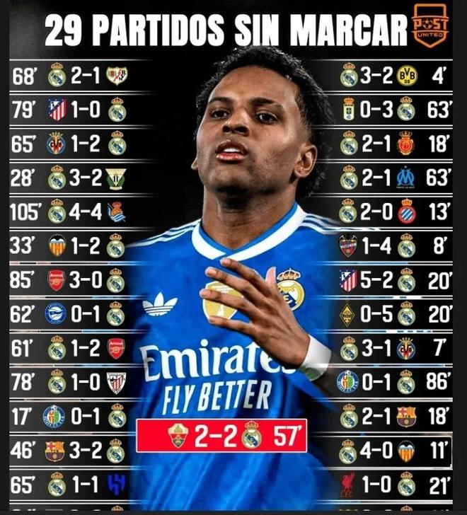此役之前,皇马先后0-0战平巴列卡诺、2-2与埃尔切握手言和,2轮西甲联赛只拿到2分。此役面对身处降级区的赫罗纳,阿隆索的球队看到了赢球止跌的希望。比赛开始后,皇马在控球率和射门次数上占据了绝对上风,姆巴佩和维尼修斯都有不错的得分机会,可惜都未能把握住。第41分钟,姆巴佩捅射破门但手球在先被判无效。4分钟后,欧纳希劲射破门,赫罗纳半场1-0领先。 易边再战,皇马继续加强攻势。第63分钟,维尼修斯将球送进球门,但因为越位在先被取消。第67分钟,维尼修斯成功造点,姆巴佩操刀主罚一蹴而就,皇马1-1扳平比分。第72分钟,罗德里戈替补出场换下琼阿梅尼。而在第90分钟,A费和贡萨洛加西亚也披挂上阵,但皇马最终还是未能改写比分。两队最终1-1握手言和。 此役,皇马控球率达到60%,创造了25次射门机会但仅有4次射正打进1球,2次绝佳破门机会浪费1次。而主场作战的赫罗纳则4射4正打进1球,还浪费了2次绝佳破门机会。罗德里戈出战18分钟,但没有获得射门机会,突破、关键传球和成功争顶次数也均为0。赛后,他只得到了6.4分的及格分数。 这场比赛之后,罗德里戈已经连续30场比赛、1339分钟没能取得进球,这使他在场次上追平了皇马队史前锋最长球荒的纪录。在这之前,皇马队史不进球场次纪录为马里亚诺保持,但他的出场时间则为986分钟,比罗德里戈少了足足353分钟。
