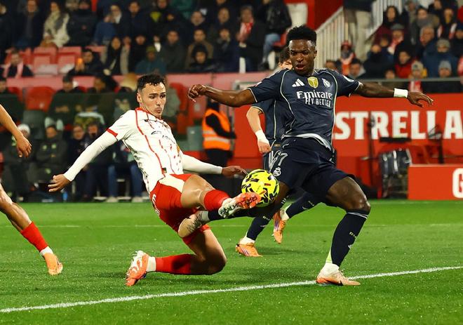 比赛开始后皇马没有意外占据进攻主导权,只是银河战舰上半场10次射门,只有1次命中门框范围内;第9分钟,姆巴佩禁区内过人摆脱回敲,居莱尔弧顶处不停球劲射稍稍高出;第12分钟,赫罗纳后场失误,姆巴佩小角度射门打高;第23分钟,维尼修斯肋部强突禁区左脚低射,皮球还是偏离了球门。 第41分钟,姆巴佩门前混战当中机敏捅射破门,但经过VAR回放判定手球在先进球无效;逃过一劫的赫罗纳反而率先打破场上僵局;第45分钟,齐甘科夫右路一记横传轻松打穿防守,欧纳希点球点爆射入网,0:1!