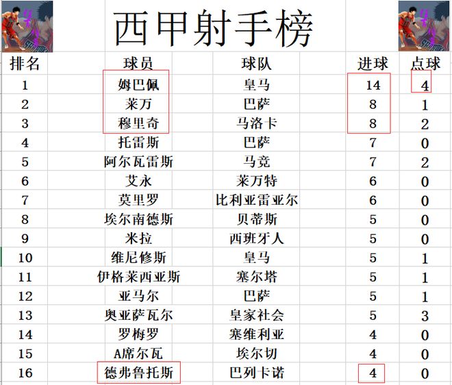 射手榜方面,前十没有变化,姆巴佩14球高居榜首,莱万和穆里奇8球并列第2,托雷斯,阿尔瓦雷斯7球并列第4。德弗鲁托斯今天未能进球,还是差1球才能追上维尼修斯,亚马尔等人挤入前十。 |
