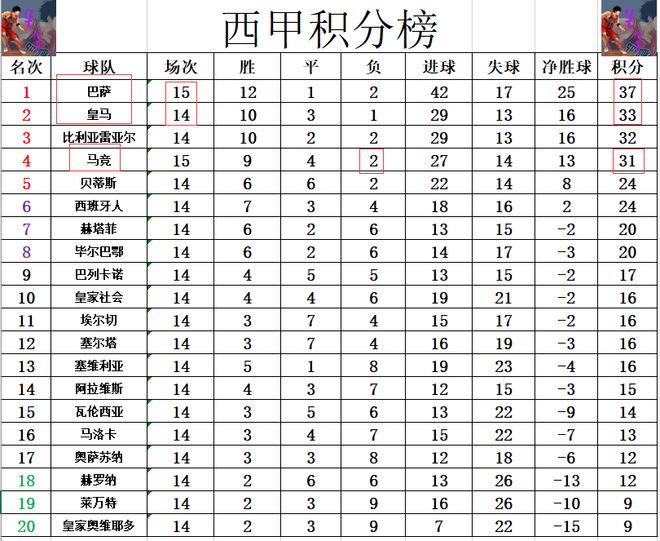 积分榜方面,巴萨逆转击败马竞后豪夺5连胜,先赛的情况下,他们从落后皇马5分,到现在领先皇马4分。皇马之前连续踢了3个客场,结果连续被中下游弱旅逼平,明天皇马叕是客场作战,对阵毕尔巴鄂竞技,若还是无力赢球,那他们很可能第2都保不住。马竞今天是有机会超过皇马的,但是他们先赢后输,13轮不败被终止,还是落后皇马2分位列第4。