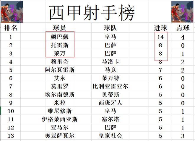射手榜方面,姆巴佩14球继续领跑,莱万今天本来有机会缩小差距,但是点球都没有罚进。托雷斯打入锁定胜局一球后,倒是追上了莱万,他们和阿尔瓦雷斯并列第2,落后姆巴佩6球。亚马尔没有进球,还是和维尼修斯,奥亚萨瓦尔等人5球刚好挤入前十。 |