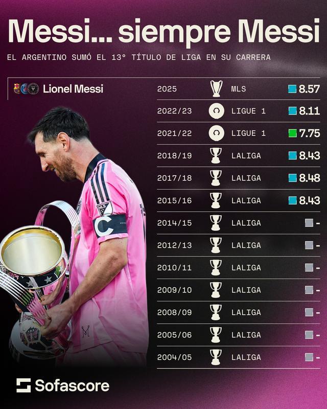 梅西职业生涯获得13座联赛冠军:西甲10冠、法甲2冠、美职联1冠