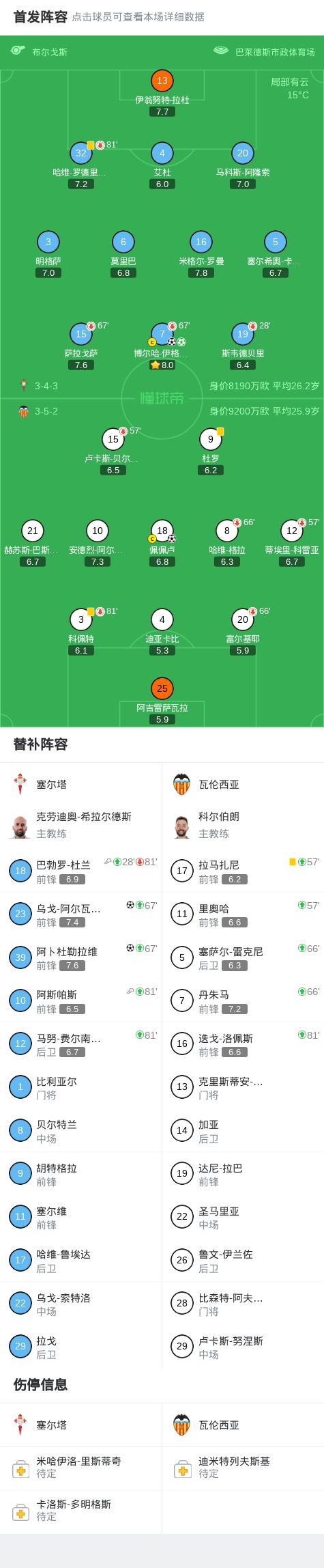 第7分钟,瓦伦西亚球员佩佩卢将点球罚丢。 第33分钟,塞尔塔球员博尔哈-伊格莱西亚斯罚入点球。 第59分钟,塞尔塔球员巴勃罗-杜兰助攻博尔哈-伊格莱西亚斯打入一球。 第70分钟,瓦伦西亚球员佩佩卢打入一球。 第83分钟,塞尔塔球员阿卜杜勒拉维打入一球。 下半场补时第4分钟,塞尔塔球员阿斯帕斯助攻乌戈-阿尔瓦雷斯打入一球。 球队阵容