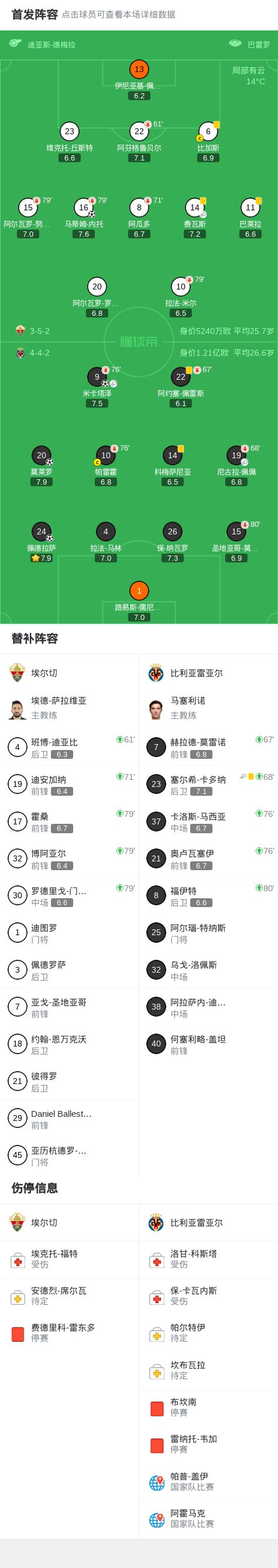 第7分钟,比利亚雷亚尔球员米卡塔泽助攻莫莱罗打入一球。 第13分钟,比利亚雷亚尔球员尼古拉-佩佩助攻米卡塔泽打入一球。 第30分钟,埃尔切球员费瓦斯助攻马蒂姆-内托打入一球。 第83分钟,比利亚雷亚尔球员塞尔希-卡多纳助攻佩德拉萨打入一球。 球队阵容