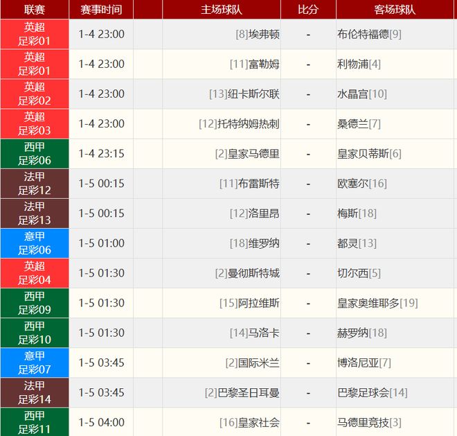 英超 伯恩茅斯 2-3 阿森纳 北京时间1月4日01:30,英超联赛第20轮,阿森纳客场挑战伯恩茅斯。上半场加布里埃尔送礼,埃瓦尼尔森破门,随后加布里埃尔补射破门将功补过扳平比分,半场阿森纳暂1-1伯恩茅斯;下半场厄德高助攻赖斯破门帮助枪手反超比分,随后萨卡助攻赖斯再下一城,克鲁皮为伯恩茅斯扳回一球,最终阿森纳3-2逆转伯恩茅斯,联赛五连胜,先赛6分领跑。 西甲 西班牙人 0-2 巴萨 北京时间1月4日04:00,西甲联赛第18轮,西班牙人坐镇RCDE体育场迎战巴萨。上半场霍安·加西亚神扑,两队暂0-0战平;下半场霍安·加西亚再献神扑,费尔明分别助攻奥尔莫和莱万破门,最终巴萨2-0西班牙人,各项赛事八连胜,先赛情况下7分领跑。 意甲 亚特兰大 1-0 罗马 北京时间1月4日03:45,意甲联赛第18轮,亚特兰大坐镇主场蓝色竞技场迎战罗马。上半场,斯卡尔维尼先拔头筹,斯卡马卡破门被吹。易边再战,苏莱、迪巴拉造险。最终亚特兰大1-0罗马。积分榜方面。罗马33分第五,亚特兰大25分第八。 意甲 尤文图斯 1-1 莱切 北京时间1月4日01:00,意甲联赛第18轮,尤文坐镇安联竞技场迎战莱切。上半场,邦达首开纪录。尤文半场0-1落后莱切。下半场,麦肯尼扳平比分,随后戴维罚丢点球。最终尤文1-1战平莱切,联赛3连胜遭终结。 其他赛事比分: 澳超 布里斯班狮吼 0-3 惠灵顿凤凰 澳超 墨尔本城 0-0 悉尼FC 英超 阿斯顿维拉 3-1 诺丁汉森林 英超 布莱顿 2-0 伯恩利 英超 狼队 3-0 西汉姆联 意甲 科莫 1-0 乌迪内斯 意甲 热那亚 1-1 比萨 意甲 萨索洛 1-1 帕尔马 西甲 塞尔塔 4-1 巴伦西亚 西甲 奥萨苏纳 1-1 毕尔巴鄂竞技 西甲 埃尔切 1-3 比利亚雷亚尔 法甲 摩纳哥 1-3 里昂 法甲 尼斯 1-1 斯特拉斯堡 法甲 里尔 0-2 雷恩 赛事前瞻敬请留意 |