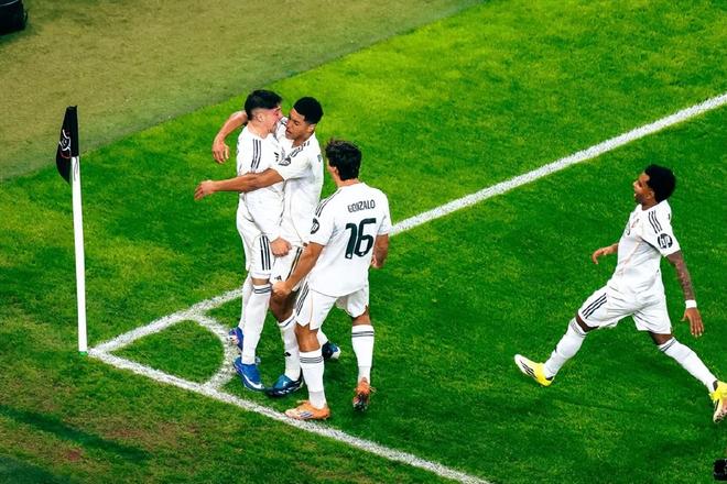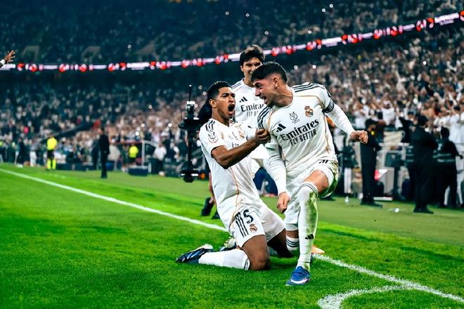 马竞上轮联赛被皇家社会逼平,继续稳稳排在联赛前四,赛季首回合的马德里德比,马竞5:2取得大胜。姆巴佩还未伤愈,上轮联赛上演帽子戏法的贡萨洛-加西亚继续首发与维尼修斯、罗德里戈、贝林厄姆搭档进攻线;楚阿梅尼、卡马文加双后腰;巴尔韦德回撤与劳尔-阿森西奥、吕迪格、卡雷拉斯组成后防线,库尔图瓦镇守球门。 开场仅仅2分钟时间,皇马便取得梦幻开局,巴尔韦德弧顶处前沿任意球一脚大力轰门直接轰入死角,奥布拉克是毫无办法,1:0!这是巴尔韦德本赛季打进的第一粒进球。