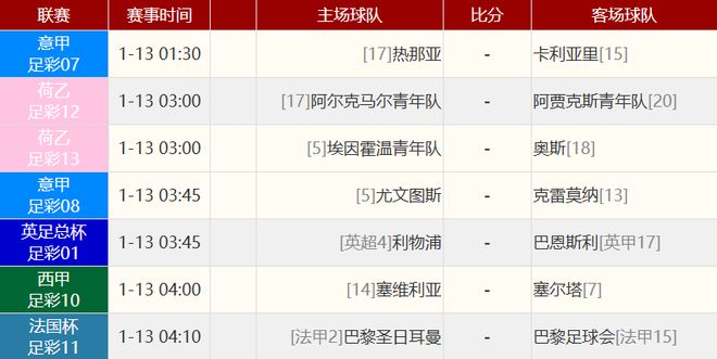 英足总杯 曼彻斯特联 1-2 布莱顿 北京时间1月12日00:30,英格兰足总杯第3轮,曼联主场迎战布莱顿。上半场,达洛特错失单刀机会;格鲁达帮助布莱顿取得领先;拉门斯后场送礼险些丢球!下半场,维尔贝克爆射破门弑旧主;舍什科头球帮助曼联扳回一城;小将莱西90分钟砸球发泄,两黄变一红被罚下!最终,曼联1-2不敌布莱顿,足总杯一轮游出局。 英足总杯 朴茨茅斯 1-4 阿森纳 北京时间1月11日22:00,英格兰足总杯第3轮,阿森纳客场挑战朴茨茅斯。上半场埃泽失误被断球,毕肖普破门,多泽尔自摆乌龙,马丁内利头球破门助阿森纳反超,随后他还有一次补射击中立柱,马杜埃凯造点,随后他自己主罚打偏,半场枪手暂2-1朴茨茅斯;下半场马丁内利双响,最终阿森纳4-1朴茨茅斯,晋级32强。 西超杯 巴萨 3-2 皇家马德里 1月12日03:00,西班牙超级杯决赛,巴萨迎战皇家马德里,比赛在沙特吉达阿卜杜拉国王体育城体育场进行。上半场,拉菲尼亚失单刀+破门,维尼修斯一条龙建功,莱万再下一城,贡萨洛再扳平,上半场补时阶段双方打进三球。半场结束双方2比2战平。易边再战,拉菲尼亚再进一球,德容直红。最终巴萨3-2皇马夺冠。 德甲 拜仁慕尼黑 8-1 沃尔夫斯堡 北京时间1月12日00:30,德甲联赛第16轮,拜仁慕尼黑主场迎战沃尔夫斯堡。上半场,迪亚斯左路传中造成费舍尔乌龙,佩伊契诺维奇扳平比分,迪亚斯头球破门。下半场,奥利塞轰进世界波,随后他造成延斯乌龙,格雷罗、凯恩和格雷茨卡随后各进一球。最终拜仁慕尼黑8-1大胜沃尔夫斯堡。本场比赛过后,拜仁慕尼黑14胜2平拿到44分,以11分领跑,沃尔夫斯堡拿到15分,排在联赛第十四。 意甲 国际米兰 2-2 那不勒斯 北京时间1月12日03:45,意甲联赛第20轮,国际米兰主场迎战那不勒斯。上半场,迪马尔科小角度破门,麦克托米奈扳平比分!下半场,姆希塔良禁区内被踩到,VAR判罚点球!孔蒂不满判罚吃到红牌!恰尔汗奥卢点射命中;麦克托米奈梅开二度再度扳平!最终,国米2-2战平那不勒斯,意甲6连胜终结,暂时3分领跑;那不勒斯排名第3。 意甲 佛罗伦萨 1-1 AC米兰 北京时间1月11日22:00,意甲联赛第20轮,佛罗伦萨主场迎战AC米兰。上半场,普利西奇两失单刀,德赫亚屡献神扑!佛罗伦萨主帅瓦诺利染红。下半场,科穆佐破门帮助佛罗伦萨取得领先!恩昆库90分钟绝平!最终,AC米兰1-1战平佛罗伦萨,意甲两连平! 其他赛事比分: 亚青U23 中国U23 1-0 澳洲U23 亚青U23 泰国U23 1-1 伊拉克U23 英足总杯 德比郡 1-3 利兹联 英足总杯 诺维奇 5-1 沃尔索尔 英足总杯 谢菲尔德联队 3-4 曼斯菲尔德 德甲 门兴格拉德巴赫 4-0 奥格斯堡 西甲 巴列卡诺 2-1 马洛卡 西甲 莱万特 1-1 西班牙人 意甲 维罗纳 0-1 拉齐奥 意甲 莱切 1-2 帕尔马 赛事前瞻敬请留意 |