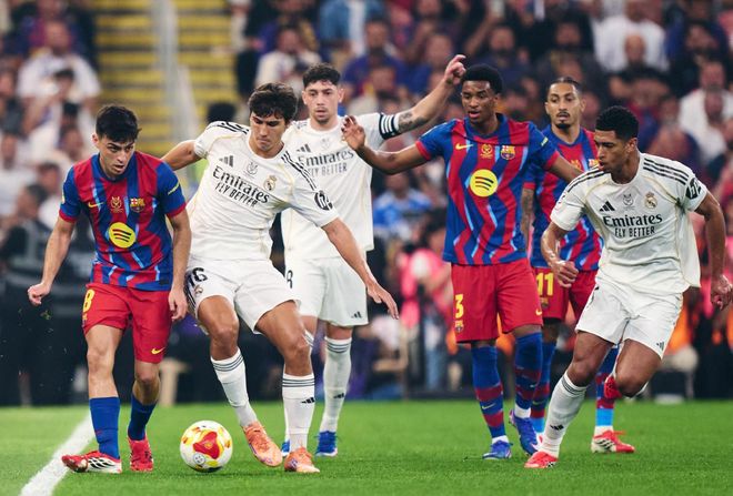 在上赛季的西超杯决赛,巴塞罗那5-2送给银河战舰一场耻辱性的失利问鼎冠军,为了能够实现卫冕的目标,弗里克此役也是毫无保留,祭出了433的体系,霍安加西亚镇守龙门,巴尔德、加西亚、库巴西和孔德构筑后防,佩德里、德容和费尔明坐镇中场,拉菲尼亚、莱万和亚马尔组成进攻三叉戟。