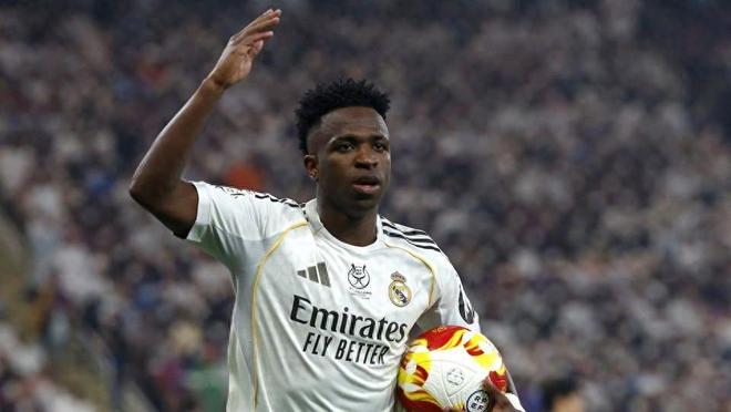 尽管皇家马德里在1月12日凌晨的西班牙超级杯决赛中以2比3惜败巴塞罗那,但维尼修斯却用一粒惊艳世界的进球,为自己、也为整场比赛留下了难以磨灭的高光时刻。 比赛第45+2分钟,皇马正处逆境——比分落后、场面被动、士气低迷。就在这最需要英雄挺身而出的时刻,身披7号战袍的维尼修斯站了出来。 他在中圈附近接球后,一路带球狂奔逾40米,连过多名巴萨防守球员,如利剑般直插禁区腹地,冷静推射破门,将比分扳为1比1!这粒进球不仅点燃了伯纳乌球迷的希望,更堪称个人能力的极致展现。