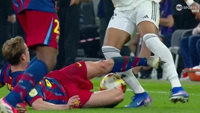 在1月12日凌晨结束的西班牙超级杯决赛中,巴塞罗那以3比2击败皇家马德里,成功捧杯。然而比赛尾声的一次争议犯规,让胜利蒙上了一层阴影。 第90+1分钟,巴萨仍以3比2领先,比赛仅剩几秒钟即将结束。此时,巴萨中场弗兰基·德容对皇马前锋基利安·姆巴佩做出一次激烈铲抢——他高抬脚底,鞋钉直接踢中姆巴佩的小腿部位。 主裁判何塞·穆努埃拉·蒙特罗当即判罚,毫不犹豫地向德容出示红牌,将其直接罚下。这一动作迅速在社交媒体上引发热议。有球迷表示:“这明显是危险动作,德容理应被重罚。”也有人担忧:“这种铲球可能导致姆巴佩严重受伤。”还有观点认为:“他可能因情绪激动而失控。” 被罚下后,德容双手抱头,显得难以置信,而巴萨队友则围住裁判试图申诉。值得注意的是,离场途中,德容脸上一度露出笑容,与倒地后表情痛苦的姆巴佩形成鲜明对比。 尽管在补时阶段少打一人,巴萨最终仍守住胜局,夺得2025年西班牙超级杯冠军。这也是加泰罗尼亚球队在过去6场国家德比中取得的第5场胜利。 |