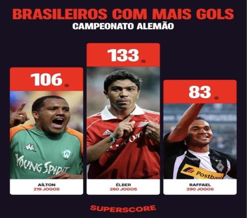 德甲进球最多的巴西球员艾尔顿 | Aílton Gonçalves da Silva 进球:106 出场:219 场均进球:0.48 德甲效力俱乐部:云达不莱梅、沙尔克04、汉堡、杜伊斯堡 埃尔伯 | Élber de Souza 进球:133 出场:260 场均进球:0.51 德甲效力俱乐部:斯图加特、拜仁慕尼黑、门兴 拉菲尔 | Raffael Caetano de Araújo 进球:83 出场:290 场均进球:0.29 德甲效力俱乐部:柏林赫塔、沙尔克04、门兴