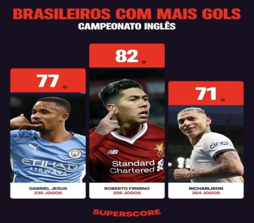 菲尔米诺 | Roberto Firmino Barbosa de Oliveira 进球:82 出场:256 场均进球:0.32 英超效力俱乐部:利物浦 理查利森 | Richarlison de Andrade 进球:71 出场:264 场均进球:0.27 英超效力俱乐部:沃特福德、埃弗顿、托特纳姆热刺