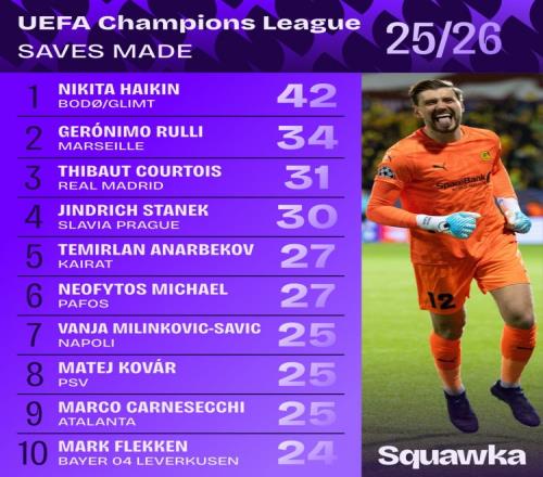 本赛季欧冠扑救榜:博德闪耀门将哈伊金42次第一库尔图瓦第三