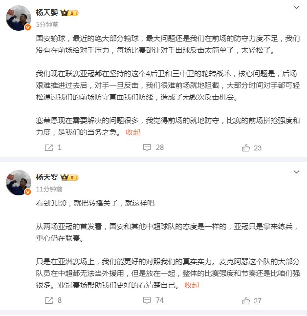 雷速体育10月2日讯 亚冠二级联赛第2轮的对决中,北京国安做客0-3完败给澳超球队麦克阿瑟。媒体人赛后集体怒批国安丢人现眼,甚至表示,如果不上主力就该给主力直接提前放假,根本不想赢球。 媒体人徐江用一个形象的比喻来点评这场比赛,“国安0-3,全场的表现像极了国庆最后一天等待放假的牛马!你要不想赢呢,你就把主力提前放假完事了,这人也去了,踢个0-3。当然,如果在澳洲原地放假,省了个回程机票,也合理! ” 媒体人陆洋则毫不客气表示,这是中超球队本周唯一丢人的外战,“本周外战唯一丢人现眼的比赛,踢亚二踢到这个份上,很难找出什么借口。有趣的是如果年底拿了足协杯,还能锁定一个明年打亚精的机会,有点儿不知说啥好了。” 北京媒体人杨天婴则认为,国安给对手的机会太轻松了,“我们现在联赛亚冠都在坚持的这个4后卫和三中卫的轮转战术,核心问题是,后场艰难推进过去后,对手一旦反击,我们很难前场就地阻截,大部分时间对手都可轻松通过我们的前场防守直面我们防线,造成了无数次反击机会。” 而北京媒体《足球100分》栏目,也直言不讳指出球队表现无法令人满意,“比赛结束,北京国安客场0比3不敌对手,亚冠二级联赛小组赛两轮仅一平一负,成绩难以令人满意。 ” |
