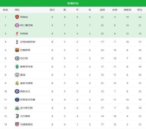 阿森纳3-2阿拉木图凯拉特(8战全胜) 本赛季欧冠联赛阶段最稳的球队阿森纳,8战全胜,直接锁定榜首。