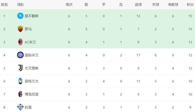 意甲第6轮进行了多场比赛。博洛尼亚在主场大获全胜,以4-0横扫比萨。坎比亚吉在第24分钟帮助博洛尼亚首开纪录。之后图雷被罚下,让比萨少踢1人。这让博洛尼亚踢得更加从容。之后莫罗、奥尔索里尼和延斯-厄德高相继进球,彻底踢爆比萨。比萨一胜难求,本赛季6场联赛2平4负。 罗马在客场完成逆袭,以2-1击败了佛罗伦萨。比赛第13分钟,佛罗伦萨就取得了进球。基恩在禁区外轰出一脚世界波,非常炸裂。但很快罗马就扳平比分。苏莱也通过远射的方式取得进球!第30分钟,克里斯坦特头球顶进,帮助罗马反超比分。之后的比赛双方再没有出现进球。罗马笑到了最后,拿到了来之不易的3分。 那不勒斯也是逆袭拿下比赛。那不勒斯此役面对的是一胜难求的热那亚。那不勒斯率先丢球。埃哈托尔脚后跟射门打进。直到第57分钟,那不勒斯才扳平比分。安古伊萨头球顶进。第75分钟,霍伊伦站了出来,他补射破门,完成致命一击,帮助那不勒斯2-1拿下比赛。 两大强队尤文图斯和AC米兰丢分了,他们之间的对决踢成了沉闷的0-0!这场比赛AC米兰获得绝佳点球机会,结果普利希奇罚丢了,直接踢飞,真是难以置信。AC米兰浪费了全场最好的机会。双方总共25次射门,结果连1粒进球都没有,真是奇葩。尤文图斯各项赛事遭遇5连平,太无奈了。 在积分榜,榜首易主了。那不勒斯5胜1负,拿到15分,排名榜首。罗马的战绩和那不勒斯一样,也是15分,但净胜球少,只能排名第2。AC米兰以13分排名第3。国际米兰12分,排名第4。尤文图斯也是12分,净胜球太少,排名第5。亚特兰大和博洛尼亚都是10个积分。 |