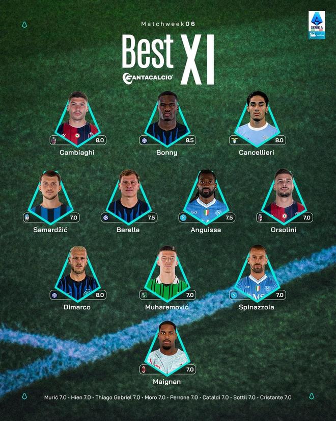 门将 迈尼昂(AC米兰)7.0分 后卫 斯皮纳佐拉(那不勒斯)7.0分、穆哈雷莫维奇(萨索洛)7.0分、迪马尔科(国际米兰)8.0分 中场 奥尔索利尼(博洛尼亚)7.0分、安古伊萨(那不勒斯)7.5分、巴雷拉(国际米兰)7.5分、拉扎尔-萨马尔季奇(亚特兰大)7.0分 前锋 坎切列里(拉齐奥)8.0分、博尼(国际米兰)8.5分、坎比亚吉(博洛尼亚)8.0分 |