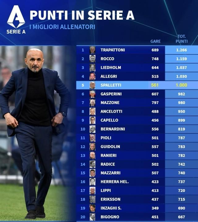 斯帕莱蒂达成意甲1000分里程碑 意甲 11-09 11:24 尤文0比0都灵,凭借这场平局,斯帕莱蒂拿到执教生涯意甲第1000分,成为特拉帕托尼、罗科、利德霍尔姆和阿莱格里之后,第5位在意甲中达到 1000 分里程碑的教练(胜场按3分计算,对手弃权算胜)。 在这561场意甲比赛中,斯帕莱蒂先后带领恩波利(34场37分)、桑普多利亚(28场34分)、威尼斯(17场15分)、乌迪内斯(117场178分)、罗马(211场422分)、国际米兰(76场141分)、那不勒斯(76场169分)和尤文图斯(2场4分),取得了289胜133平139负的战绩。