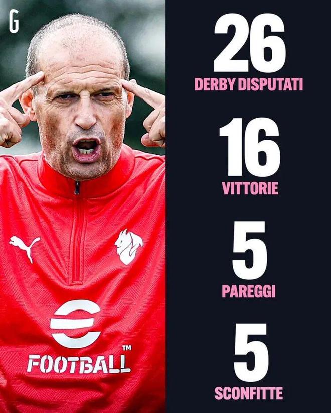 米兰圈 北京时间11月24日凌晨3点45,意甲第12轮将上演米兰德比。 据米兰体育报数据统计,米兰主帅阿莱格里此前共26次带队出战米兰德比(米兰)以及都灵德比(尤文),战绩为16胜5平5负。