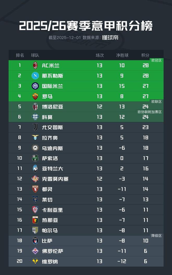 北京时间12月1日,2025/26赛季意甲联赛结束了第13轮的较量,积分榜的形势依然十分胶着。