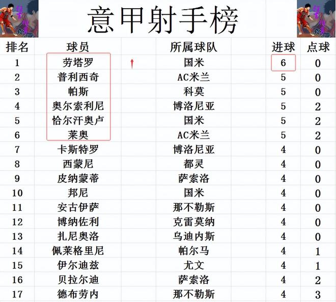 射手榜方面,终于是有人突破5球“大关”,劳塔罗昨晚梅开二度,超过普利西奇等人,6球登顶成功。普利西奇,帕斯,莱奥,恰尔汗奥卢和奥尔索里尼5球并列第2。西蒙尼,德布劳内,伊尔迪兹等人4球挤入前十。 |