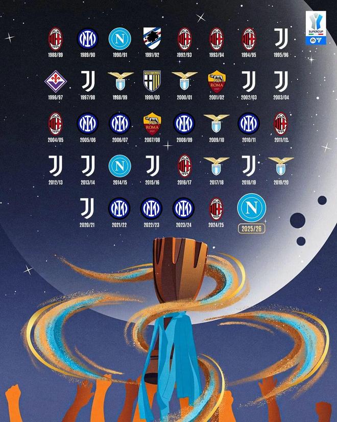 利雅得的观众们,也会为那不勒斯加油欢呼吗?从电视直播中呈现的现场氛围来看,情况并非如此。内雷斯的世界波过后,场上响起的更多地是嘘声——这或许是他们表达喝彩的一种方式。在沙特国王大学球场,主办方用两条巨型横幅覆盖了两个弧形看台的上层,试图藉此提升视觉上的上座率,可黄色的空座椅仍然到处可见。对于本届超级杯的参赛球队,当地观众有着非常鲜明的立场:两场半决赛中,他们的支持一边倒地送给了米兰城的球队,可决赛的对阵却是那不勒斯vs博洛尼亚。考虑到它们分别是上赛季的意甲联赛和意大利杯冠军,这似乎本就非常合理。 下赛季的意大利超级杯,未必还会有半决赛可看了。意甲联盟主席西蒙内利在赛前确认,在沙特连续举办了四年超级杯之后,明年将会把这项赛事移师他处。据《共和报》,新地点很可能是在美国的佛罗里达州,城市在奥兰多和迈阿密之间二选一。“或许明年我们会恢复旧赛制——联赛冠军对阵杯赛冠军,就像今晚这样。”西蒙内利继续说。所以,超级杯究竟应该是冠军之间的较量,还是亚军们也有资格参赛?看情况。真是个富有当代气息、又极具意大利风格的答案。