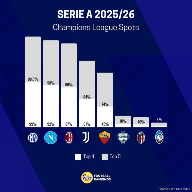 意甲方面的,目前有38%的概率获得五个下赛季欧冠席位机会,Football Rankings对意甲本赛季前五预测如下的: