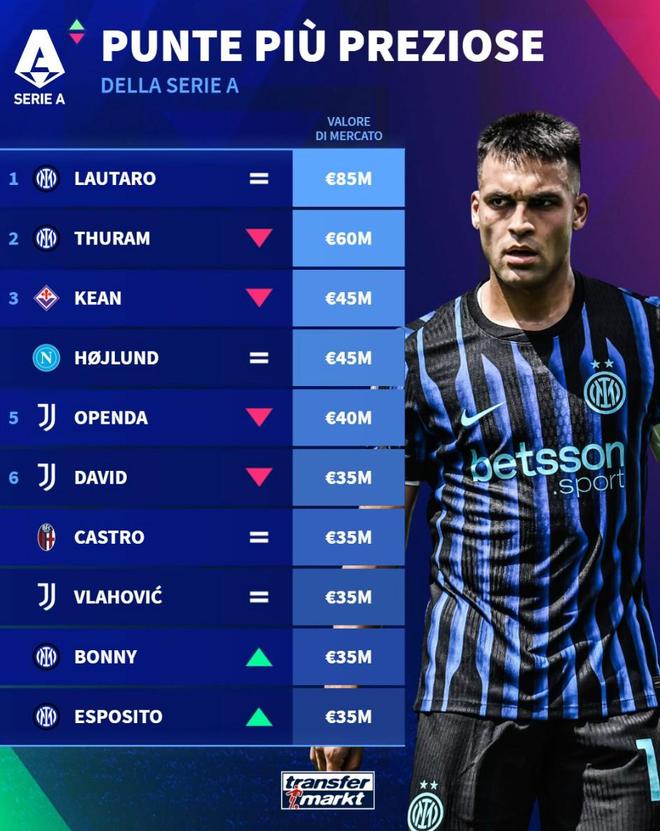 1. 劳塔罗(国际米兰) 8500万欧元 2. 马库斯-图拉姆(国际米兰) 6000万欧元 3. 莫伊塞-基恩(佛罗伦萨) 4500万欧元 3. 霍伊伦(那不勒斯) 4500万欧元 5. 奥蓬达(尤文图斯) 4000万欧元 6. 乔纳森-戴维(尤文图斯) 3500万欧元 6. 圣地亚哥-卡斯特罗(博洛尼亚) 3500万欧元 6. 弗拉霍维奇(尤文图斯) 3500万欧元 6. 博尼(国际米兰) 3500万欧元 6. 皮奥-埃斯波西托(国际米兰) 3500万欧元 【上咪咕独家看英超】 |