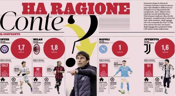 不过在本轮联赛的赛后发布会上,当记者问到为什么那不勒斯无法真正掌控比赛时,孔蒂回答道:原因有很多。这是一条刚刚开始道路,从整体结构层面来说我们还没准备好。以我看来,尤文、国米和AC米兰在结构、二队配置、薪资总额以及资产价值方面,都与其他球队不同。每当不是这三支球队中的一支夺冠,那就意味着完成了一项非凡的成就。我们试图在球场上弥补这种差距,但必须承认,这些球队本身就处在不同的层级。