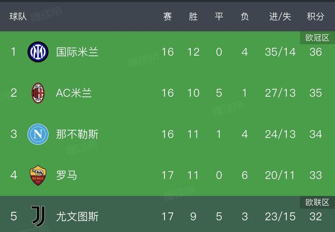 时光飞逝,本赛季意甲已经接近半程了,如果看到目前的积分榜,你会发现前五名的队伍堪称“如胶似漆”,前后之间都只有1分之差!我翻看了其他四大联赛的积分榜,没有任何一个联赛前五之间积分形势如此胶着,英超阿森纳领先第五切尔西15分,西甲巴萨多赛一场与第五西班牙人之间相差13分,德甲拜仁领先第五霍芬海姆14分,法甲朗斯与第五里昂之间的分差也有10分,而意甲国米少赛一场的情况下与排名第五的尤文之间只差了4分而已!