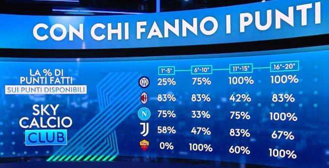这种多强林立的画面应该是意甲联盟一直梦寐以求的激烈争冠局势,这能最大限度保留争冠悬念,但是否真的能吸引那么多的球迷关注就很难说了! 不过,虽然各支强队之间都拿到了足够的分数,造就了多强林立的激烈局势,但各队之间的抢分技能却不同!根据统计,意甲排名前五在意甲各区间球队之间的抢分比例如下,我们来逐一分析一下。 榜首的国米面对前5名球队的抢分比例只有25%,接连输给了尤文、AC米兰和那不勒斯,只赢下了罗马;面对6-10名球队的抢分比例则达到75%,因为与第7名博洛尼亚的比赛还没开踢;而面对11-20名的中下游球队,国米则保持了100%的拿分比例。总结起来就是强强对话不给力,但稳定的虐菜能力保证了国米依然能够位列榜首! 第二名的AC米兰是面对前5名球队得分率最高的,能够拿到83%的分数,战平尤文,战胜国米、那不勒斯和罗马,无一败绩!但是,他面对6-10以及16-20名球队的得分率同样也是83%,面对11-15名球队的得分率更是低至42%,能够连胜多支豪强,也能与比萨、帕尔马、萨索洛等弱旅握手言和,更是输给了克雷莫内塞!总结起来就是强强对话超给力,但面对中下游球队得分能力却十分不稳定,所以即便他面对豪强无一败绩依然只能排在第二!