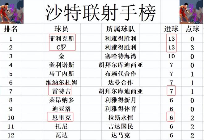 射手榜方面,利雅得胜利的葡萄牙双枪继续领跑,C罗,菲利克斯13球并列榜首。金10球排在第2,雷特吉追上维纳尔杜姆,马丁内斯,7球并列第4。恩里克点射打入一球,追上莱昂纳多,托尼,6球刚好挤入前十。 |