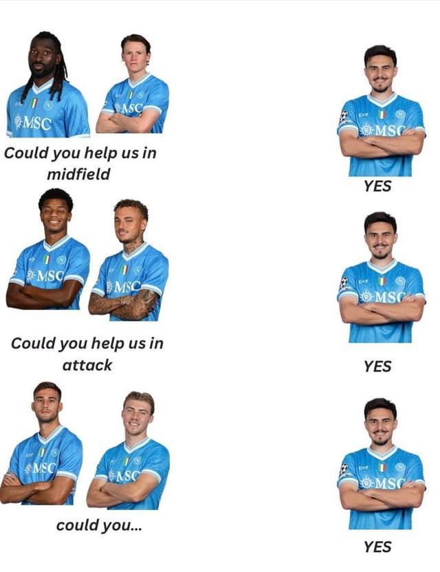 现年26岁去年夏天以租借的方式从莱比锡回到那不勒斯,赛季至今他代表那不勒斯出战了21场比赛,其中11次首发,期间他踢过的位置包括了前腰、中前卫、左中场、左边锋以及右边锋。 对于自己万金油的属性,埃尔马斯也在社交媒体上发了一张梗图进行了自嘲,这张梗图的内容是安古伊萨和麦克托米奈提问:“你能在中场帮助我们吗?”埃尔马斯回复道:“可以。”随后内雷斯和诺阿-朗提问:“你能在进攻端帮助我们吗?”埃尔马斯继续说道:“可以。”最后洛伦佐-卢卡和霍伊伦也提问:“你能......”没等他们问完,埃尔马斯抢答道:“可以。” |