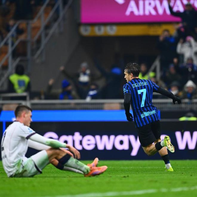 好在,这次国米没有吃亏的,第39分钟博洛尼亚一次反击不成,反倒是被国米打了反击。小图拉姆在对手正要上压力给对抗时很巧妙的脚后跟传球,劳塔罗拿到后继续向前走,又在对手即将发狠把球给到后插上的泽林斯基,这下,波兰人怒射破门助国米打破了比分上僵持!