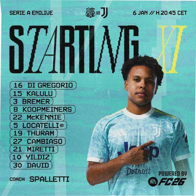尤文客战萨索洛:伊尔迪兹搭档戴维,坎比亚索、麦肯尼出战