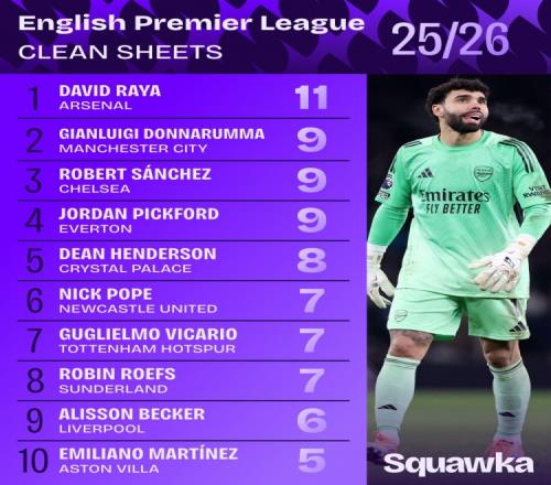 本赛季英超拉亚11场零封第一,多纳鲁马、桑切斯等人9场零封
